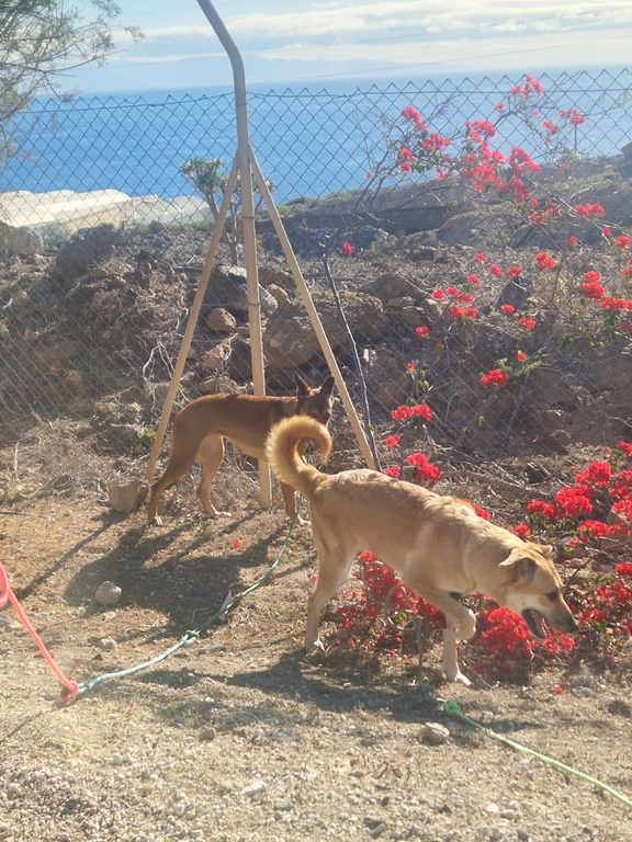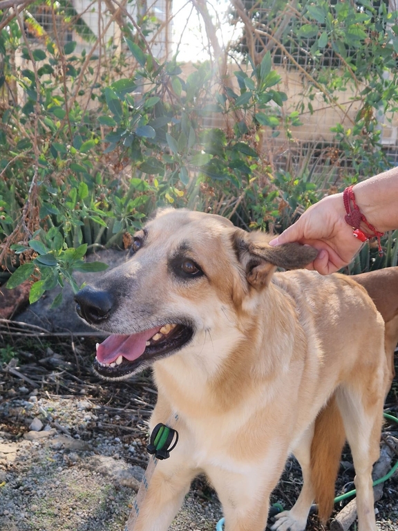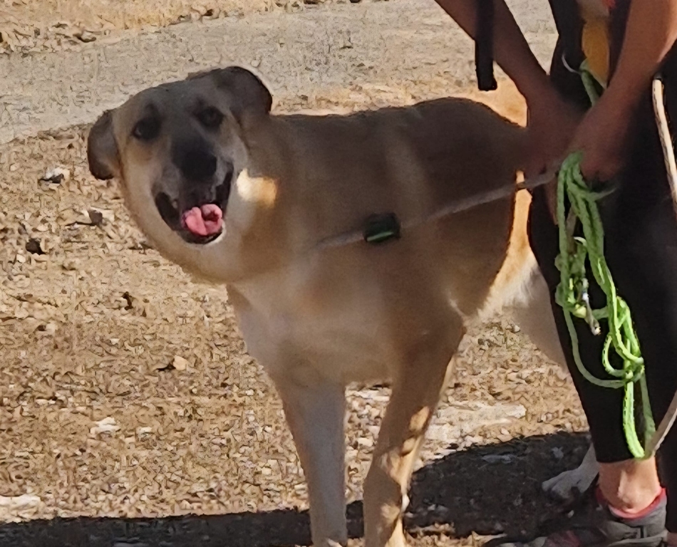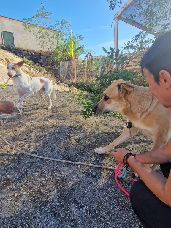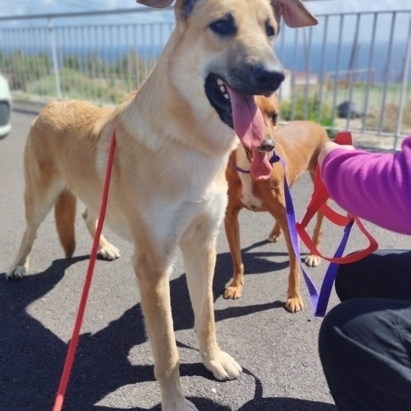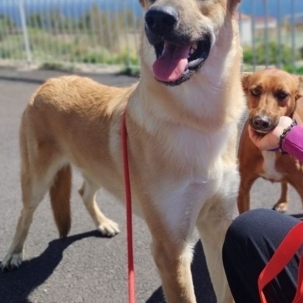 Pasea estupendamente con correa, es muy bueno con los humanos y los otros perritos, convive en el chenil con dos perros mas.