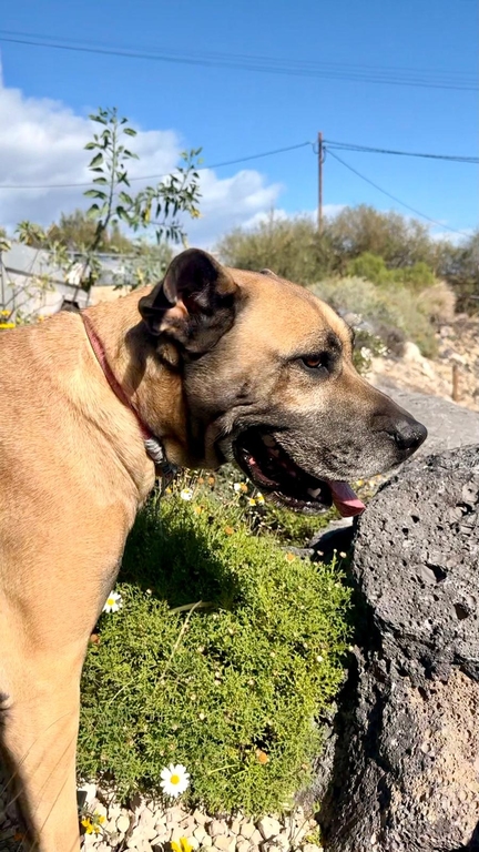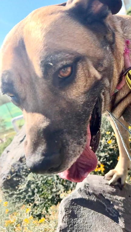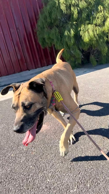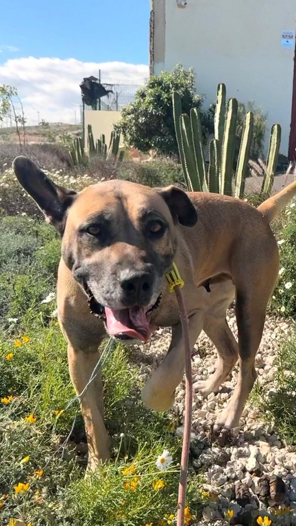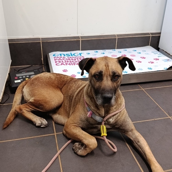 Maggie, una perrita de tamaño grande de color marrón y negro, tiene 7 años aproximadamente.